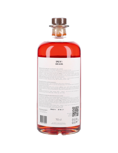 SPRZ n°1 intègre la partie vineuse traditionnellement apportée par le Prosecco. Ici, il suffit simplement d’ajouter de l’eau gazeuse bien pétillante pour retrouver les saveurs du Spritz.