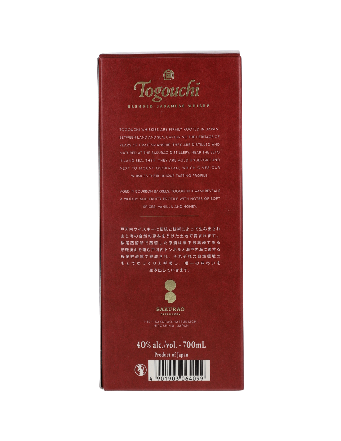 Composé d'une sélection des meilleurs fûts entrant dans l'assemblage du Togouchi Premium, la version Kiwami, qui signifie "Hauteur" en Japonais, est une véritable cuvée Prestige. Avec son nez vif et élégant qui révèle des notes fraîches et végétales d'herbe et de noix, ce blend se poursuit en bouche avec des arômes de noisette, de chocolat et miel pour s’achever subtilement sur des notes épicées composées de poivre et de noix de muscade.