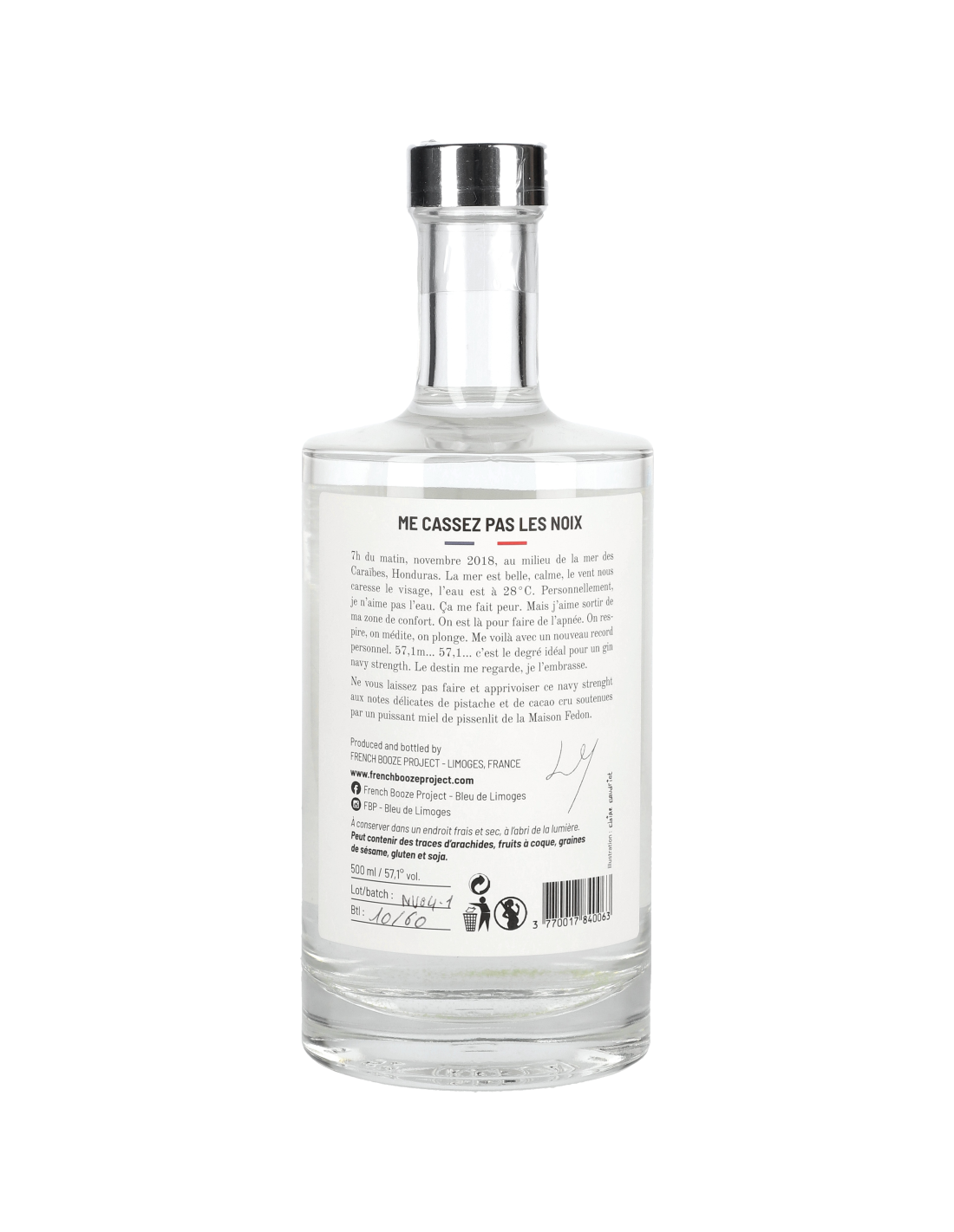 Le Gin Navy Strengh « Me cassez pas les noix » est assurément audacieux. Son nez basé sur des effluves de pistache, de noix et de miel laisse place en bouche à des notes de fèves de cacao cru amer. C’est sur le final que les noix reviennent en force, soutenues par de puissantes touches de miel de pissenlit. Le tout joliment enrobé par un côté salin qui fait immédiatement écho au grand large.