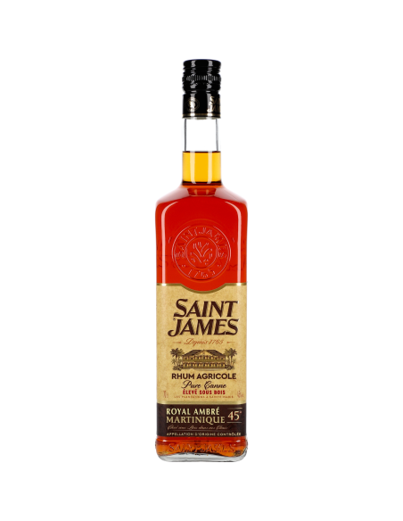 Saint-James Royal Ambré est la référence haut de gamme des rhums bruns et élevés sous bois. Elevé en doudre de chêne de 18 à 24 mois, il dégage des notes épicées (cannelle, noix de muscade), de fruits sucrées (figues, dattes) et révèle toutes les notes typiques de l'élevage sous bois (vanille, noisette grillée). Sa rondeur en fait un rhum idéal en planteur avec des fruits sucrés (mangue, ananas), ou également pur en dégustation.